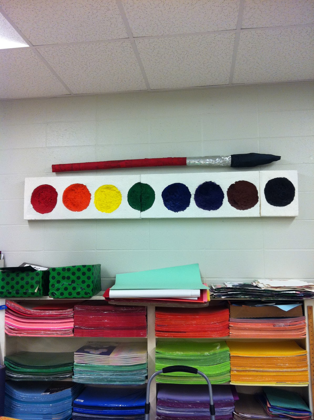 #1. Paper mache paint brush: A couple of years ago, I saw this great jumbo paint brush and palette set from Pottery Barn Kids. I totally wanted it for my classroom, but $200 was a little too pricey. Two years ago, I made the paint palette with scraps of styrofoam. This summer, I finally got around to making the paint brush using paper mache. (Thanks for the help, Emma!) I made a cool set up jumbo paper mache art supplies last summer for my other art room.This was a super easy project, both the paint palette and brush are attached to my concrete walls with foam tape and hot glue.